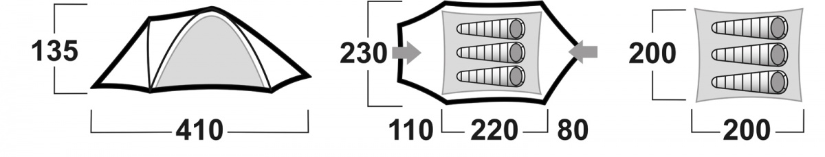 OUTER TENT: 185T polyester, polyurethane (coating 3,000 mm H2O)