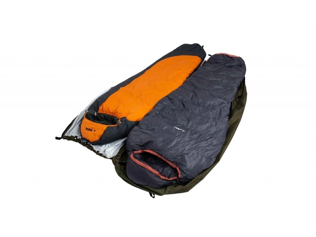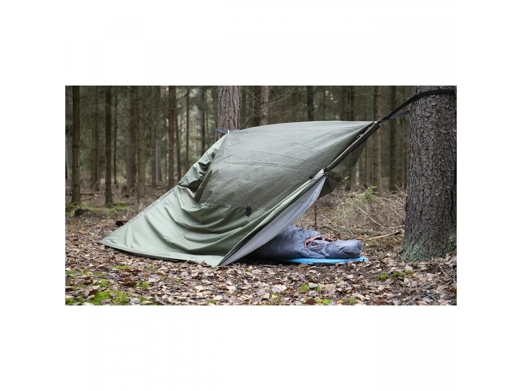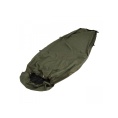 Bivouac bag with increased water resistance. BIVAK BAG with a long zipper down to the legs and added loops. The bag can be completely unzippered and unfolded. It can be used as a sheet for lying down or for throwing over two sleeping bags. It can also be used as a tent sheet to create an emergency shelter. Mosquito net in the head area.