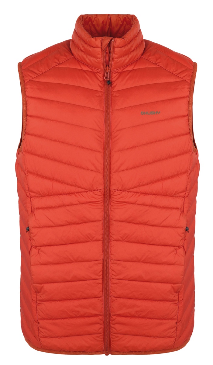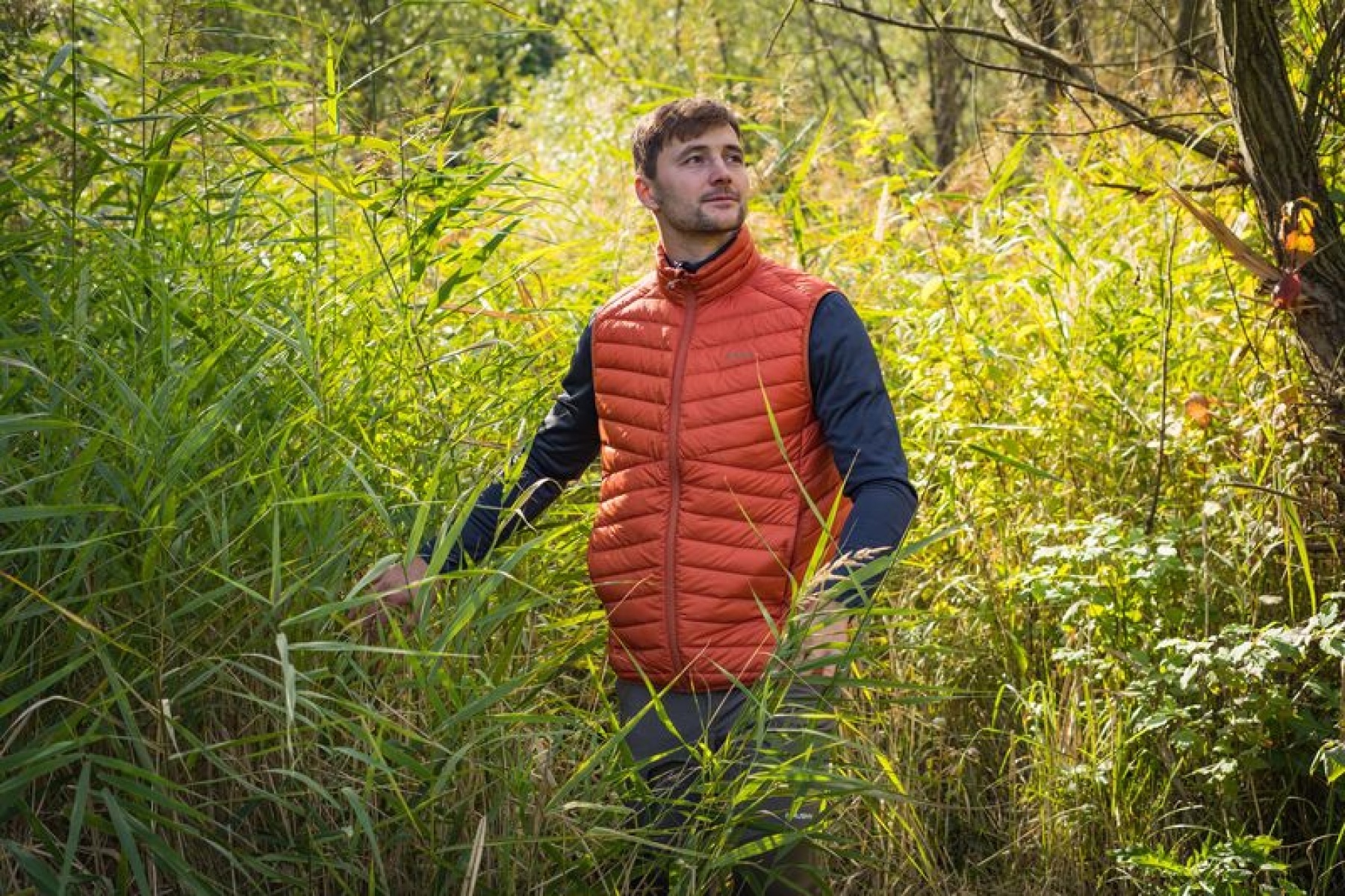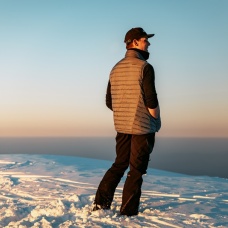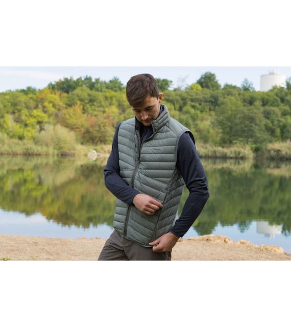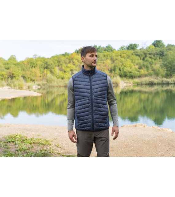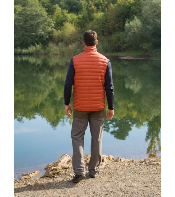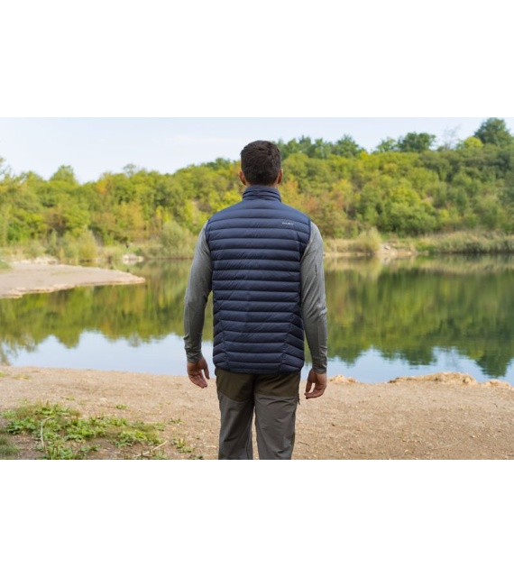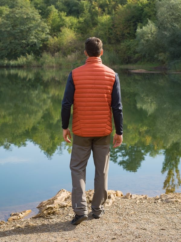 An ultralight, men’s, down zip-up gilet suitable for various outdoor activities on colder days.