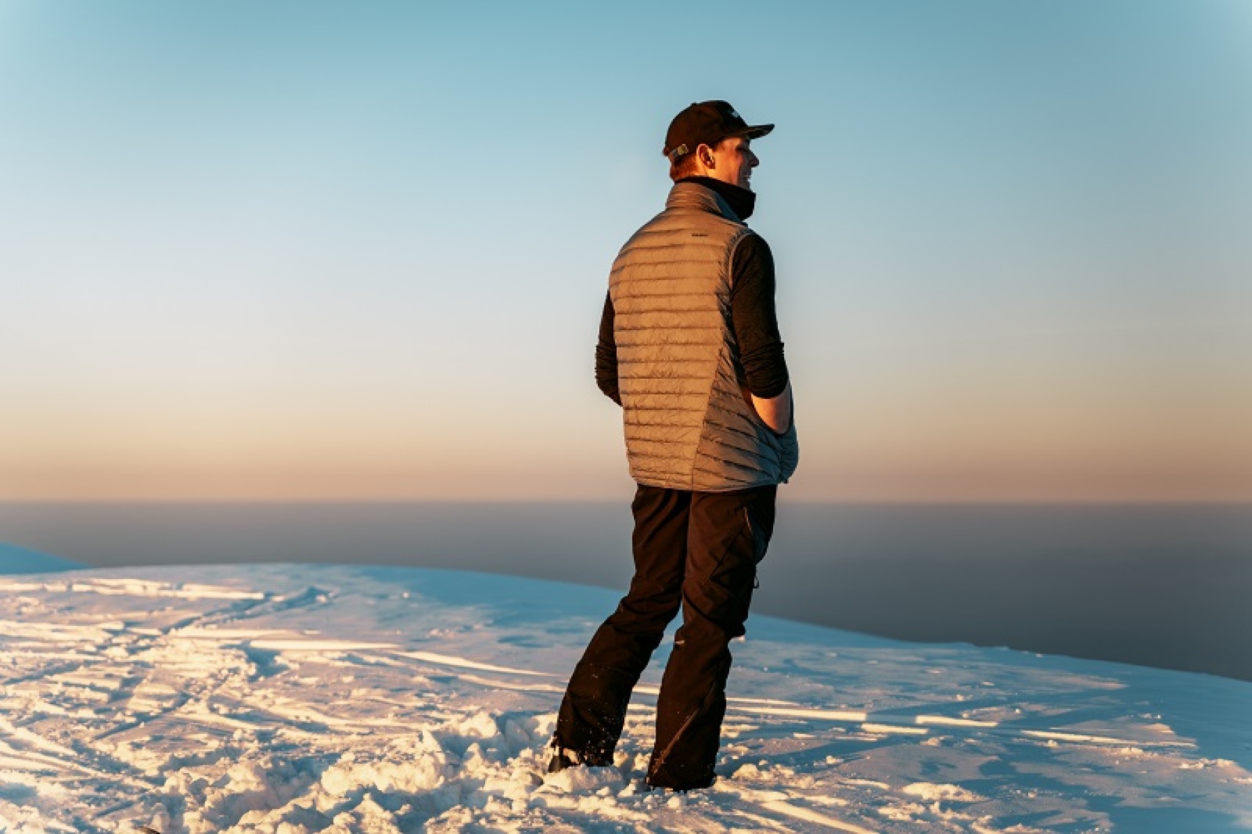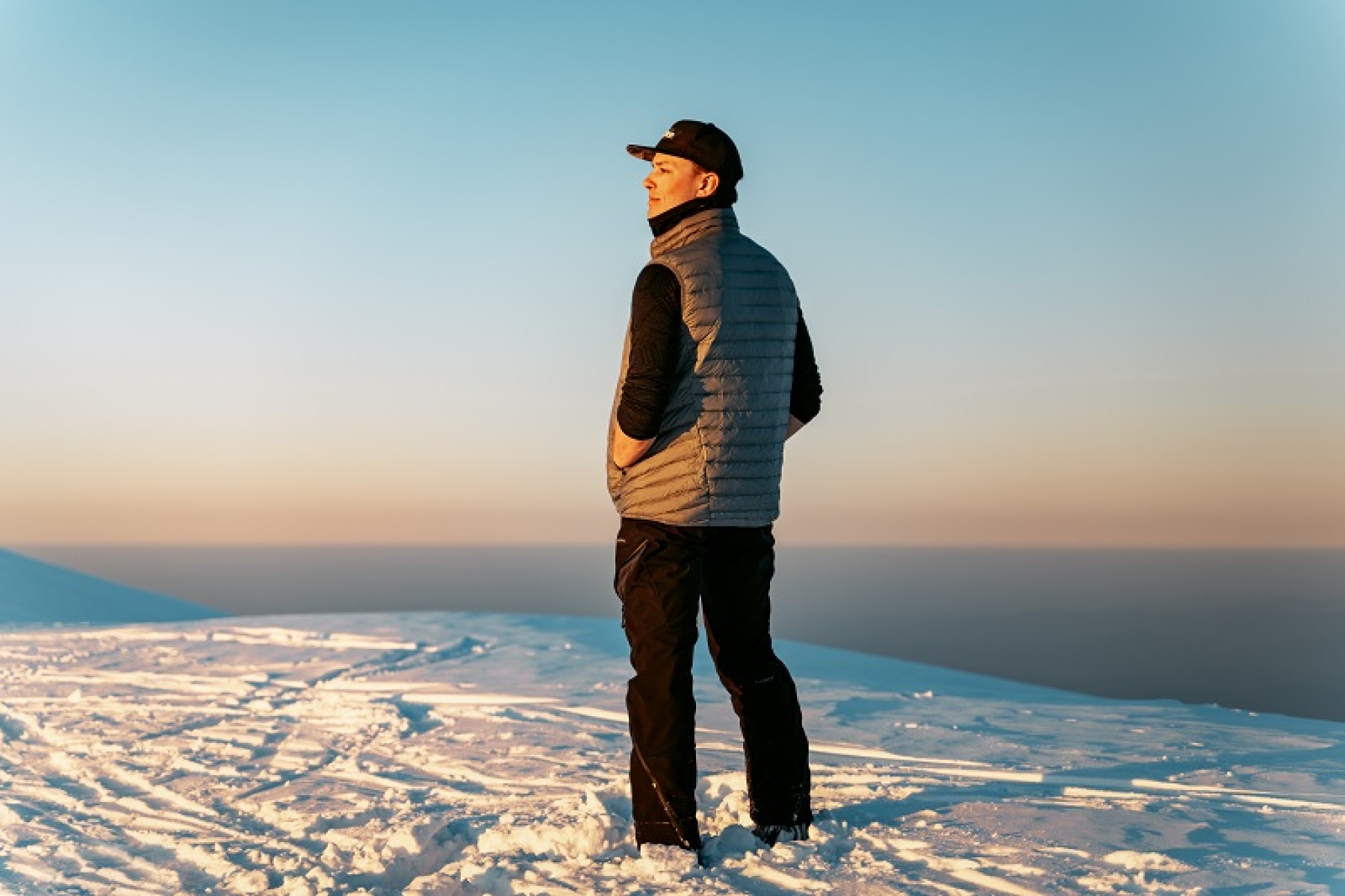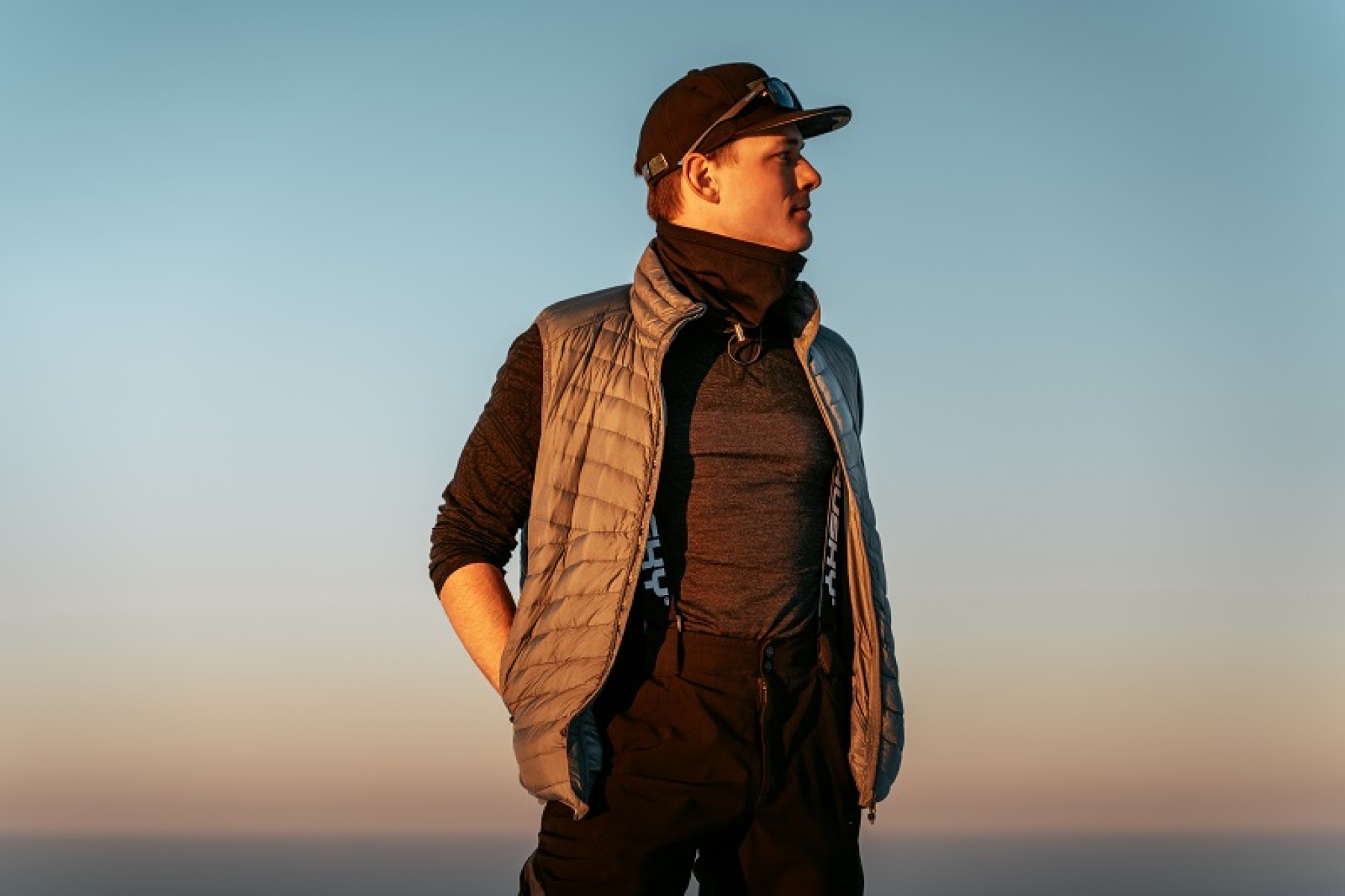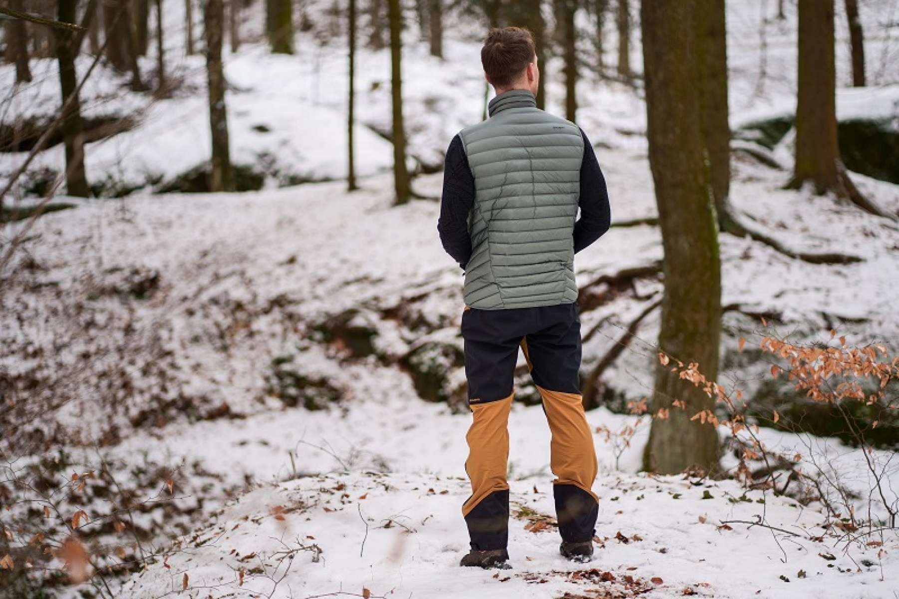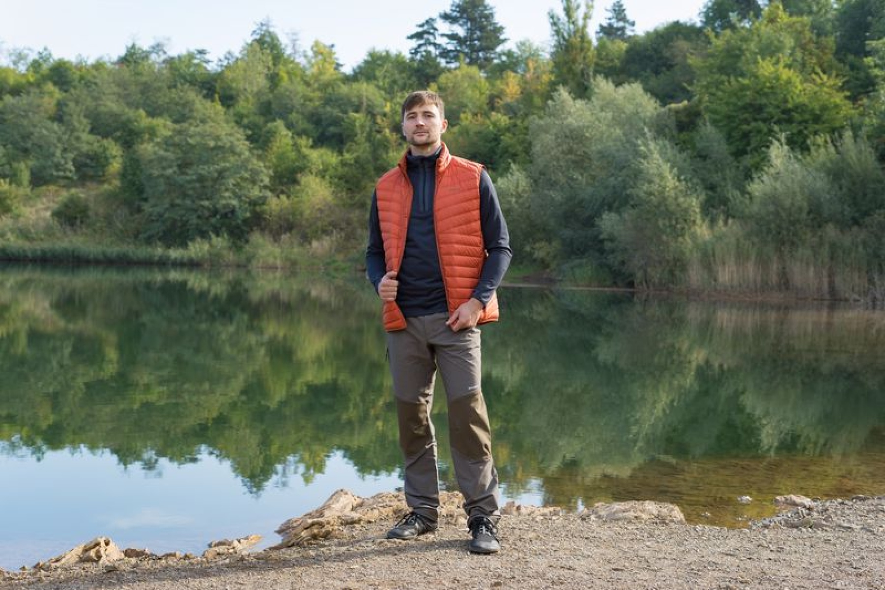 A light, men’s, zip-up gilet suitable for hiking and other outdoor activities on colder days.
