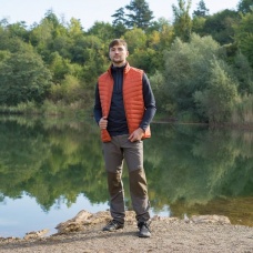 A light, men’s, zip-up gilet suitable for hiking and other outdoor activities on colder days.