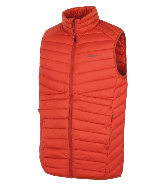 An ultralight, men’s, down zip-up gilet suitable for various outdoor activities on colder days.