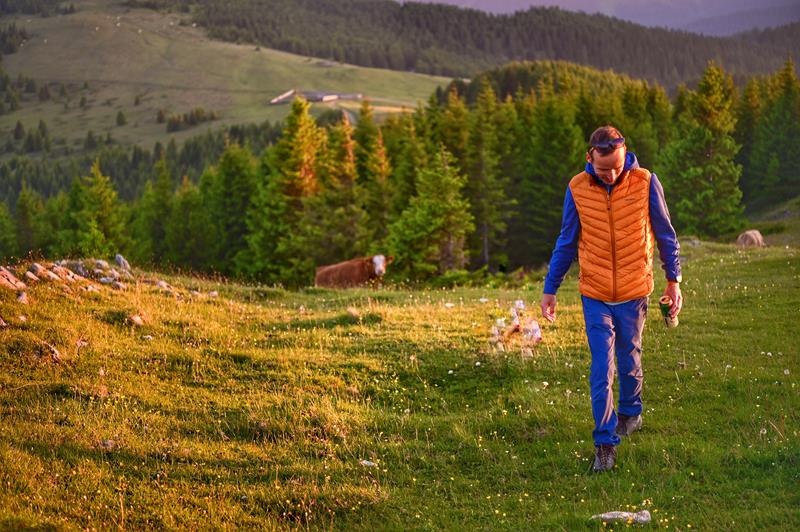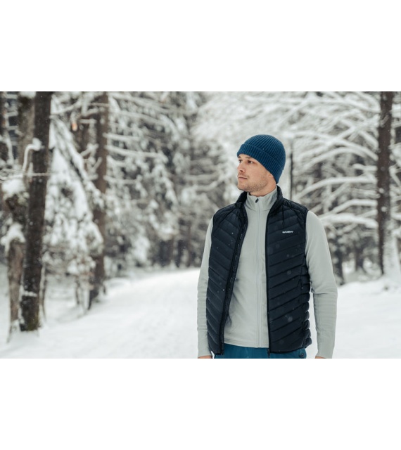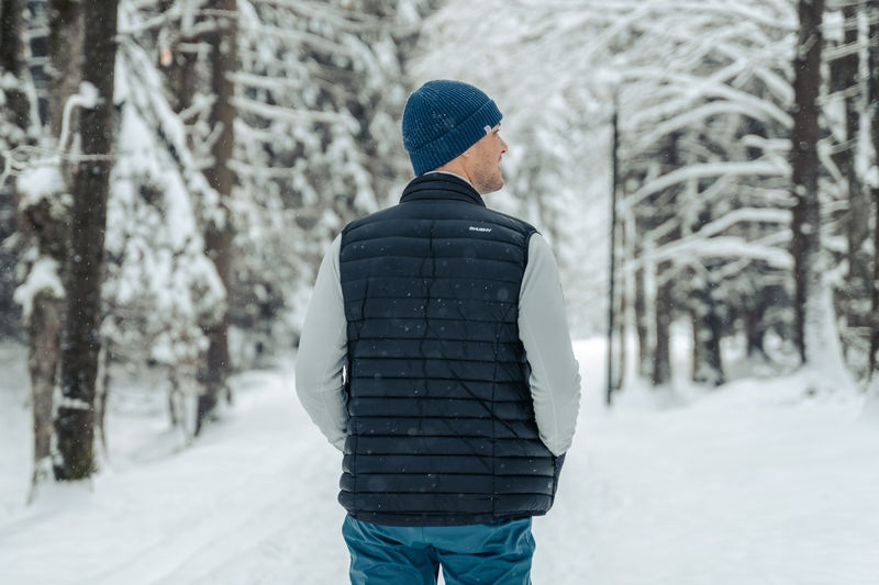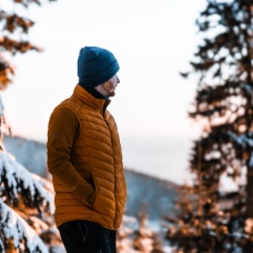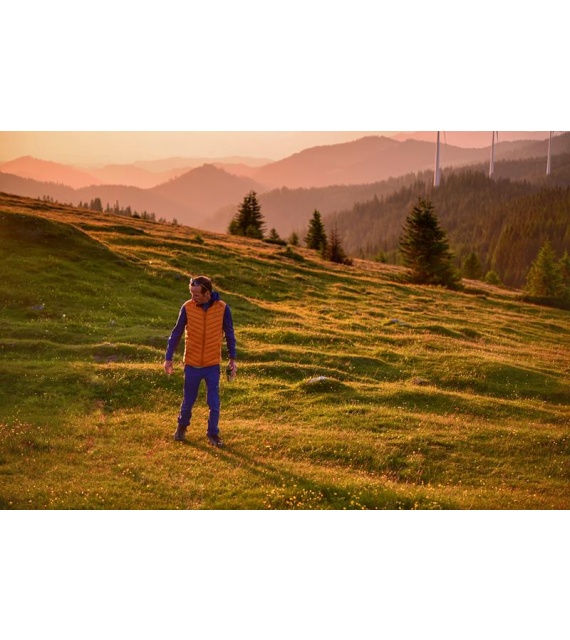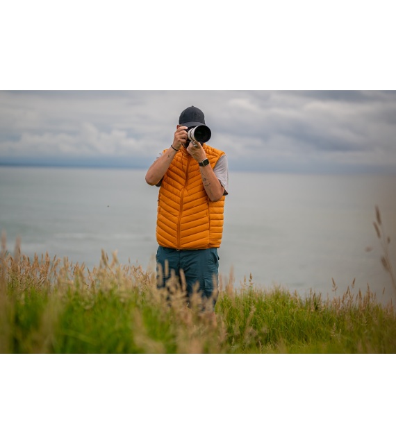 An ultralight men’s down zip-up gilet suitable for various outdoor activities on colder days