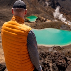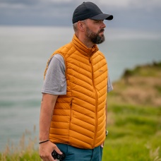 An ultralight men’s down zip-up gilet suitable for various outdoor activities on colder days