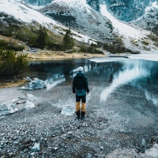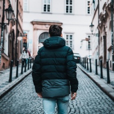 A men’s lightweight hooded down jacket suitable for winter weather.