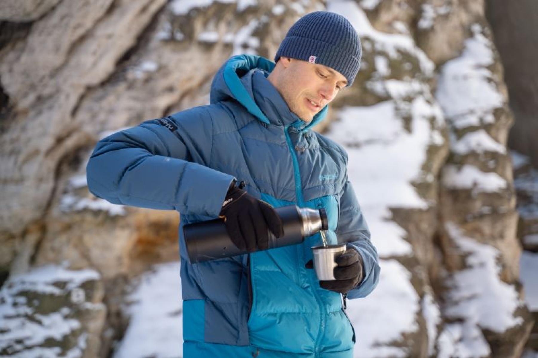 A warm men’s jacket with a high-quality duck feather filling, intended for everyday wear as well as winter outdoor activities.