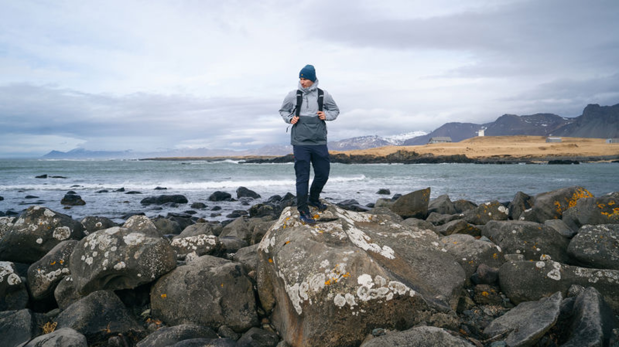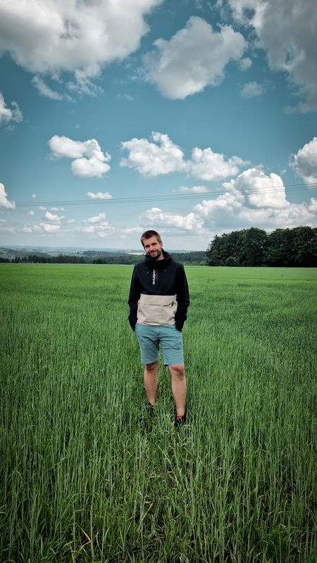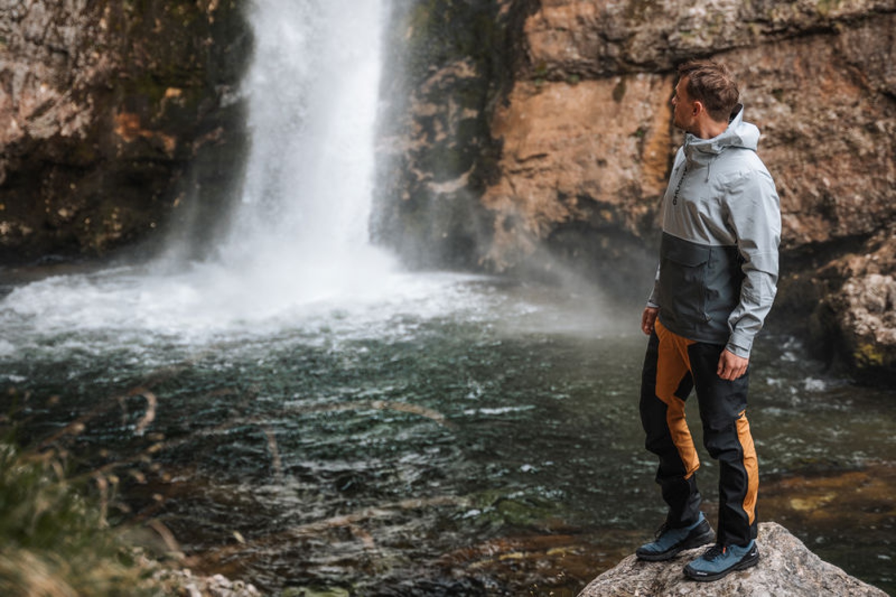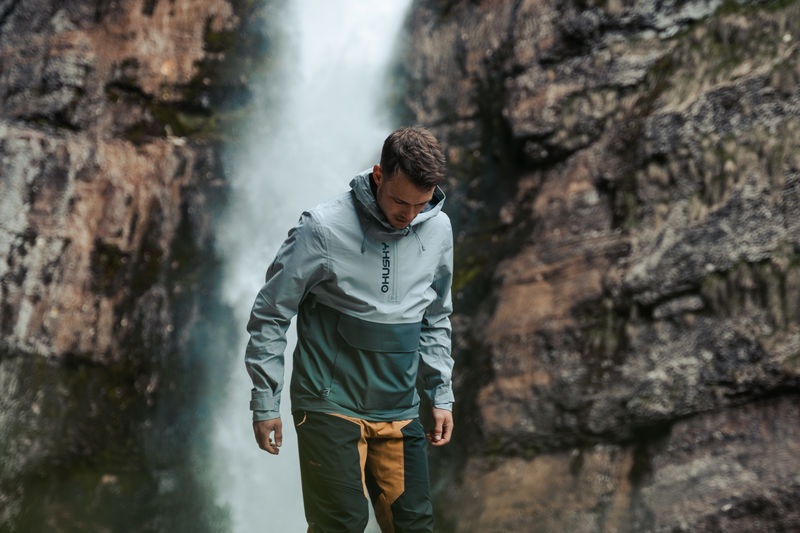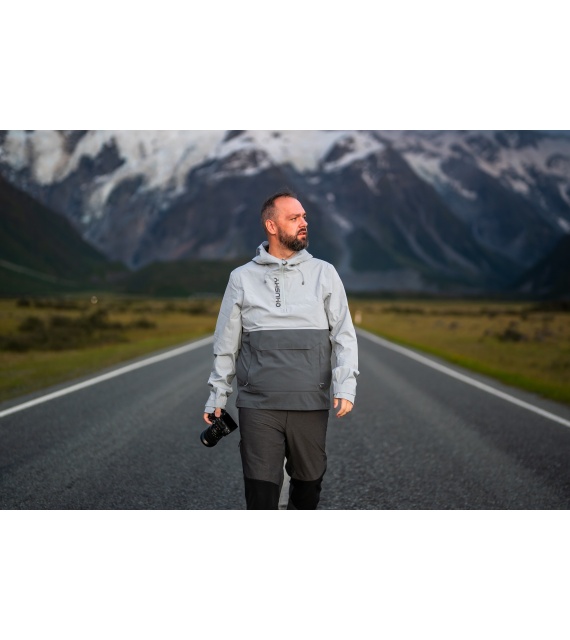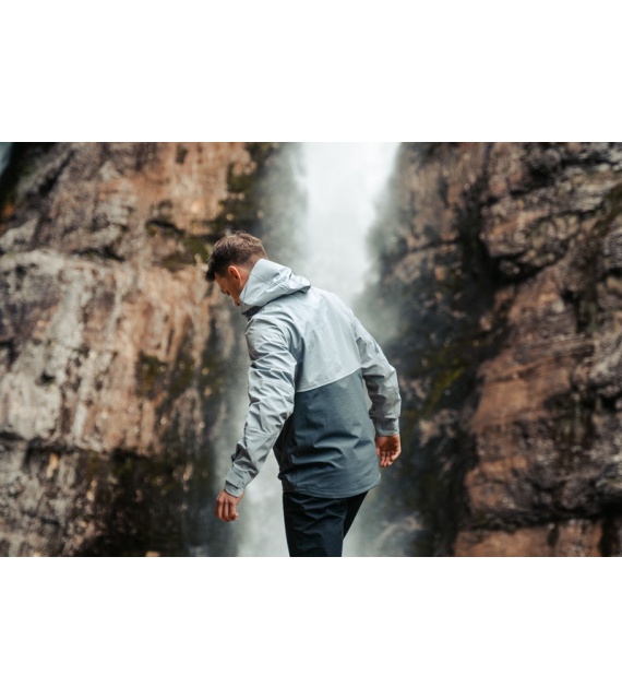 Multifunctional men’s outdoor jacket with hood, for year-round use in demanding conditions, worn both in the countryside for hiking and in the city.