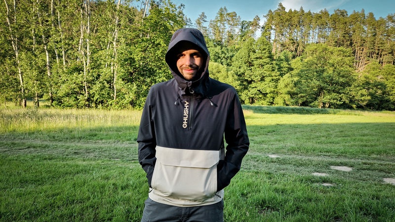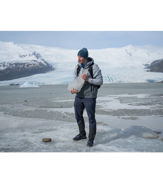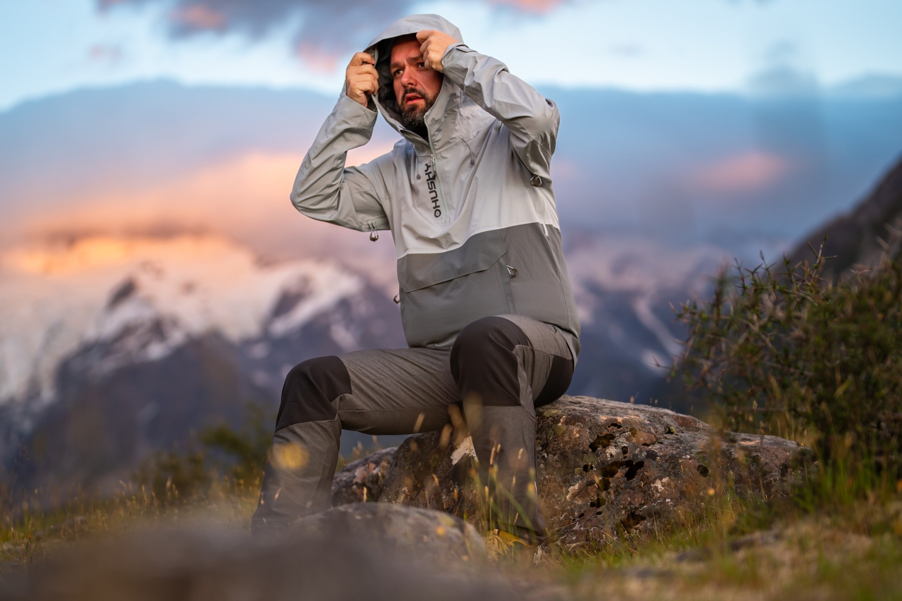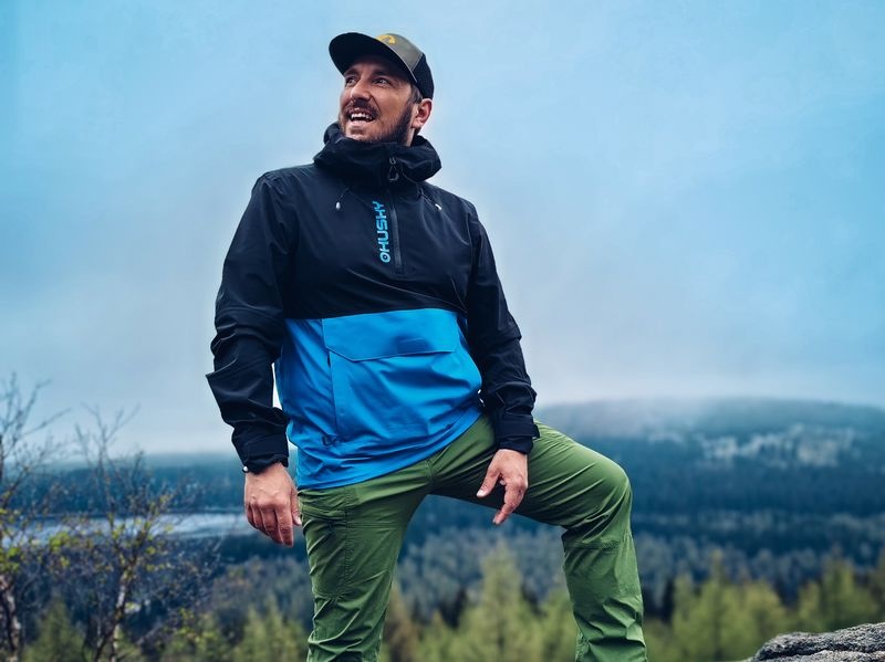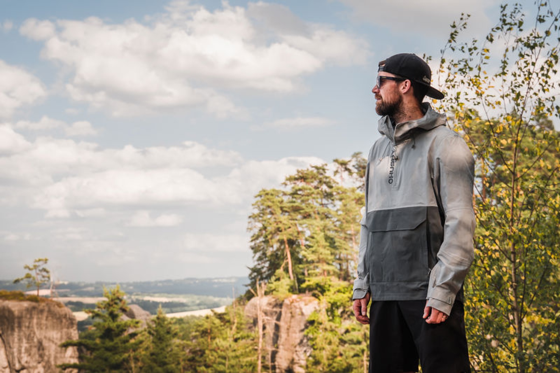 Multifunctional men’s outdoor jacket with hood, for year-round use in demanding conditions, worn both in the countryside for hiking and in the city.
