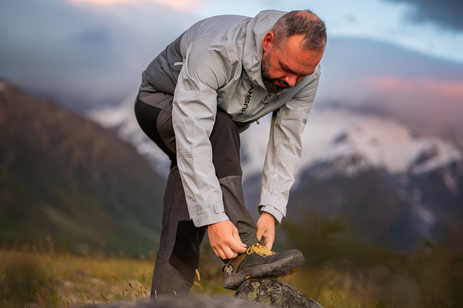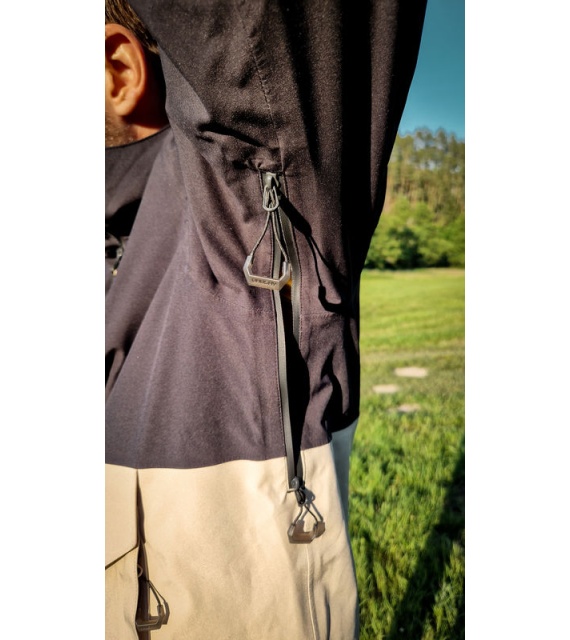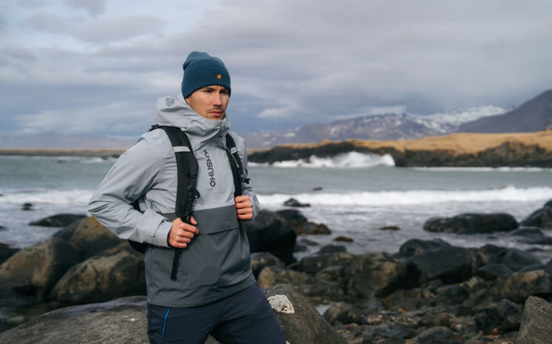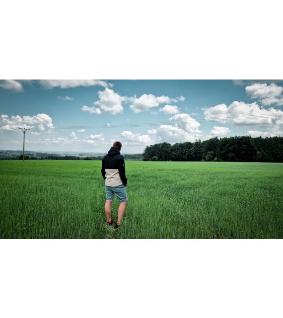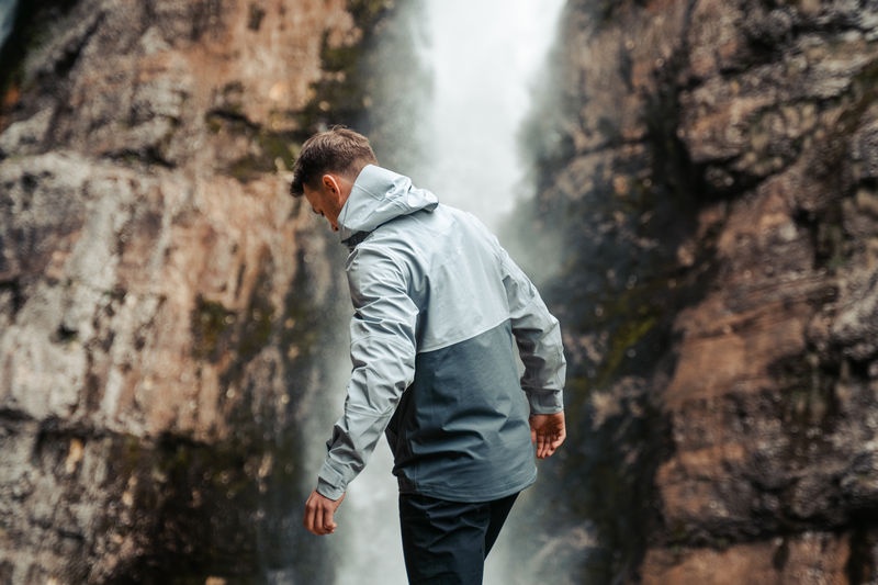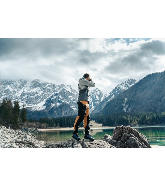 Multifunctional men’s outdoor jacket with hood, for year-round use in demanding conditions, worn both in the countryside for hiking and in the city.
