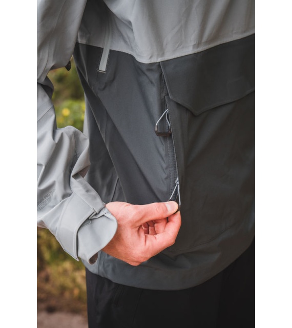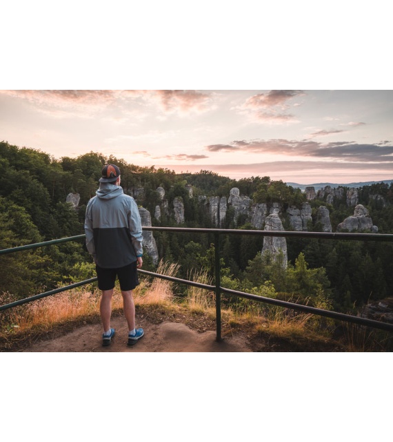 Multifunctional men’s outdoor jacket with hood, for year-round use in demanding conditions, worn both in the countryside for hiking and in the city.