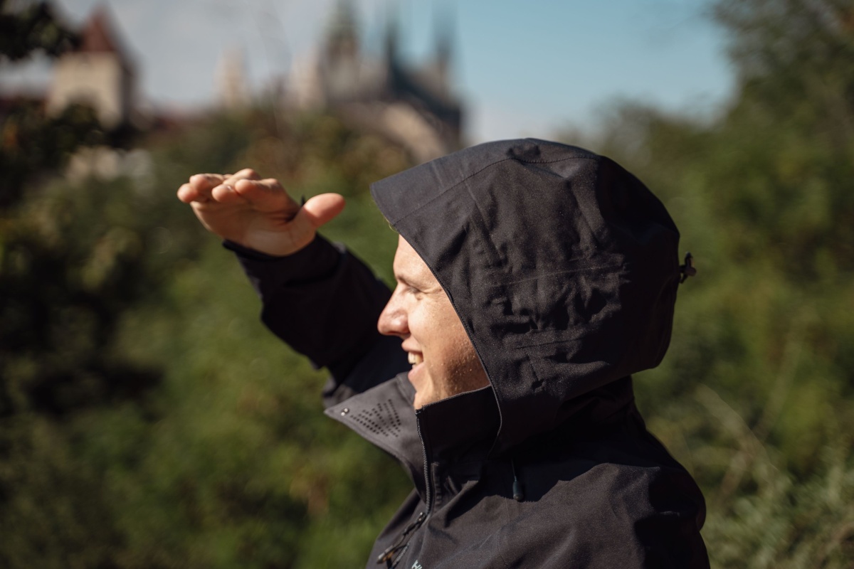 A multifunctional men’s hooded outdoor jacket for year-round use, both around town and for hiking.