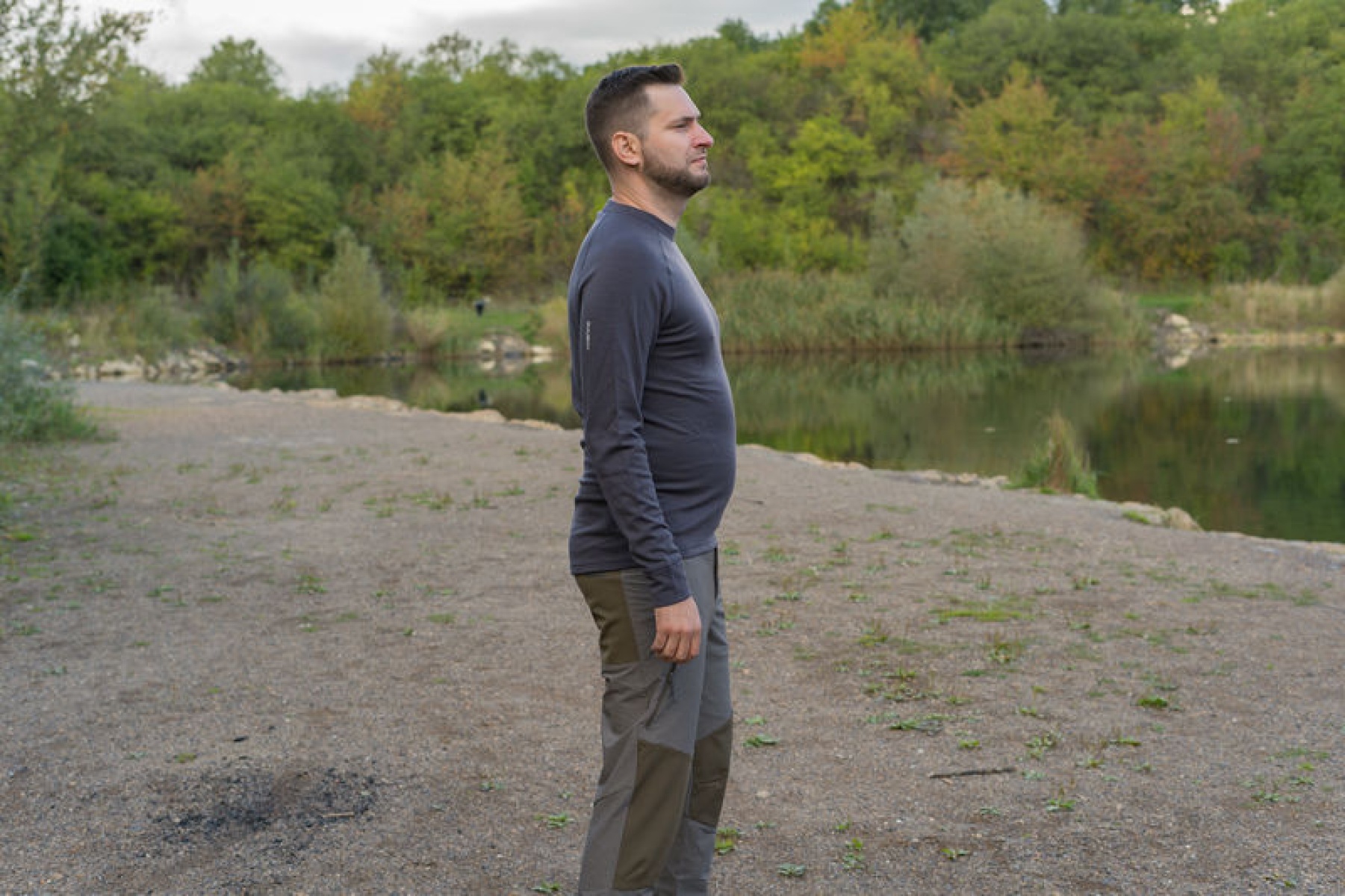 A men’s sweatshirt made of soft material containing merino wool, suitable for all outdoor activities from autumn through winter.