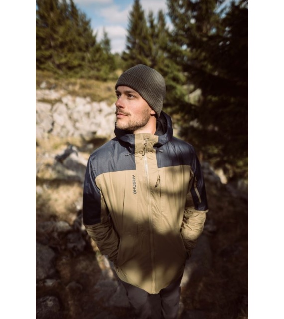 A functional hardshell membrane jacket for men suitable for challenging conditions as well as classic hiking and casual wear around town.