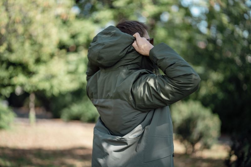 • The DWR water repellent treatment of the outer layer of the garment prevents moisture from seeping through; water beads up and immediately runs off the surface.