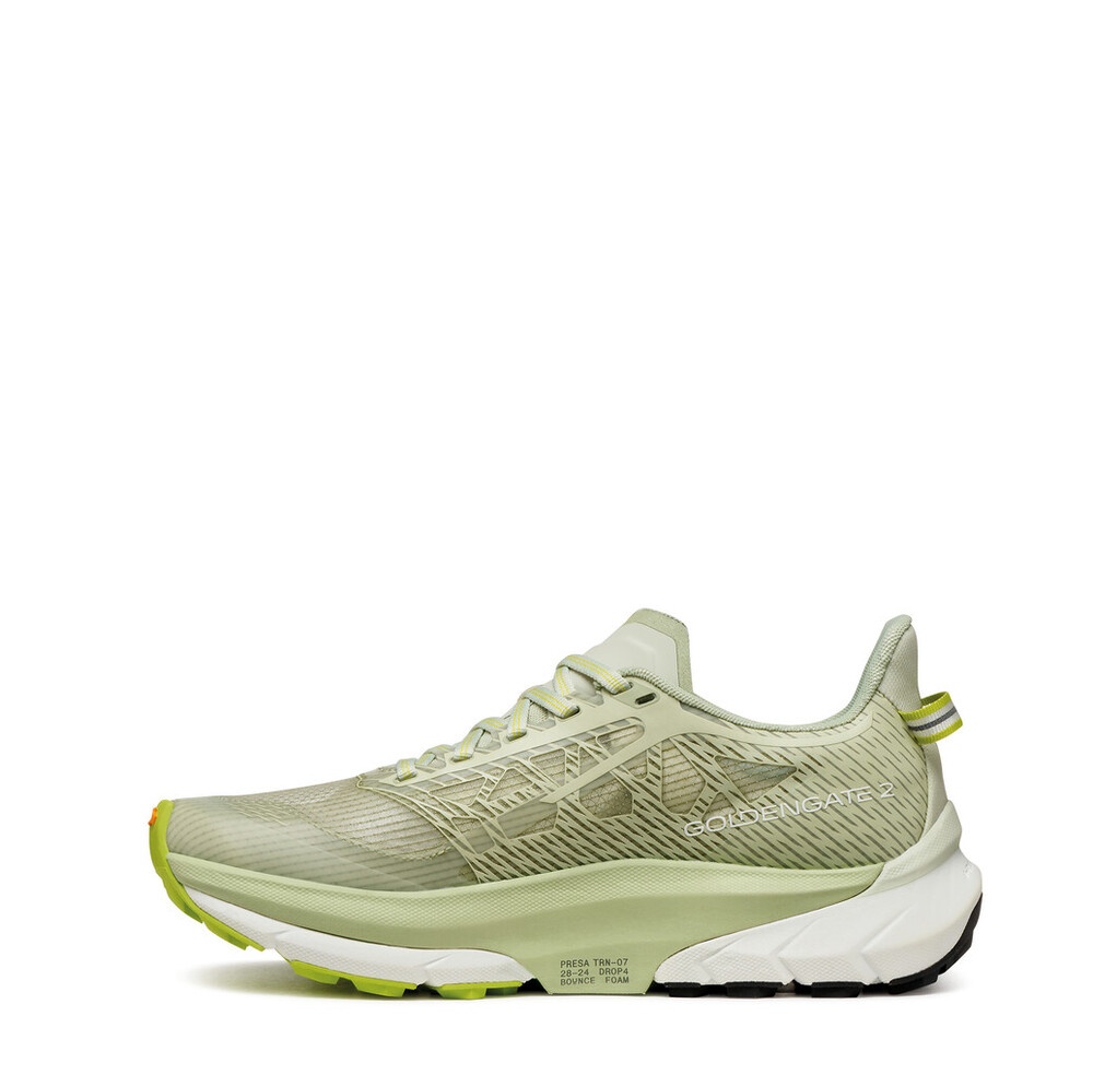 The Golden Gate 2 ATR is an exceptionally versatile women's model, this multi-terrain shoe is designed for medium and long distances. Compared to the previous version, the upper material is more durable and breathable. The new Bounce Foam midsole provides a more responsive feel and saves energy. The geometry of the dual-density I-Respond system sole allows for a smoother and more efficient stride. The breathable textile upper, made with seamless EXOskeleton technology, ensures the foot is held very stably and securely in the shoe. Thanks to the Sock-Fit LW construction, the upper hugs the foot perfectly like a sock. This eliminates pressure points and ensures maximum comfort and precision. High protection against accidental impacts thanks to the soft rubber on the toe. High grip and traction on any terrain, including asphalt, thanks to the Presa® TRN-07 sole. The sole itself is zoned for both trail and road. The i-Respond system improves the push-off phase for energy saving. Thanks to these key features, it is ideal for athletes of any weight and experience level looking for reliable and comfortable footwear for their daily runs.