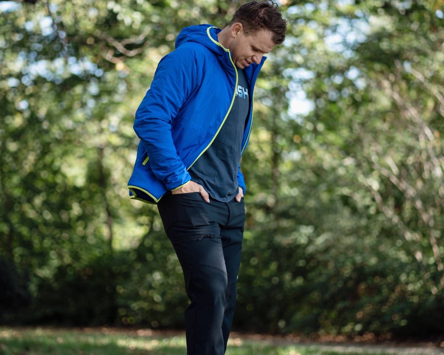 Breathable men’s softshell trousers made of durable material for outdoor and sports activities throughout the year.