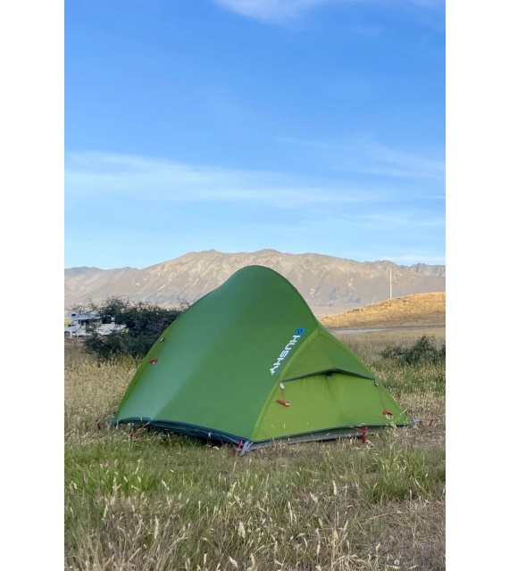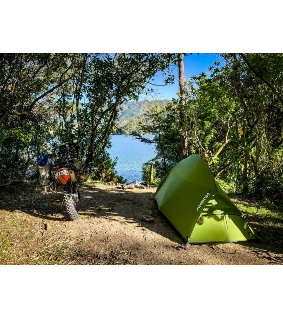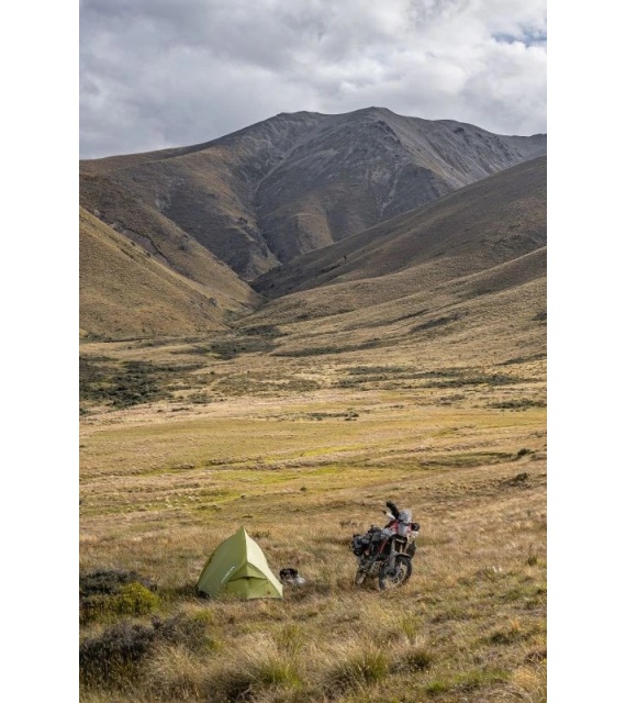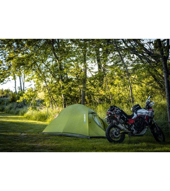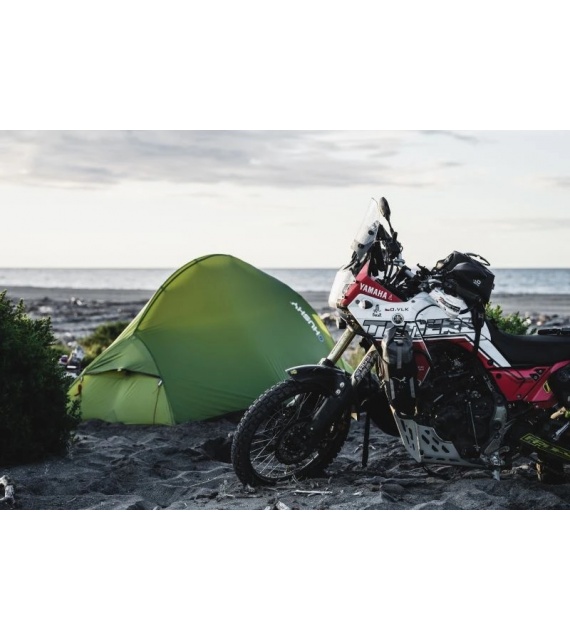 An ultralight and stable 2-person tent suitable for bicycle touring, motorcycle touring, trekking, or backpacking.