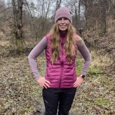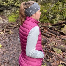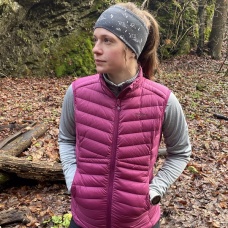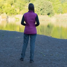 An ultralight, women’s down, zip-up gilet suitable for various outdoor activities on colder days.