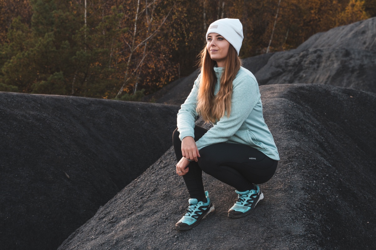 A moderately thick women’s zip-up sweater suitable for various outdoor activities, e.g. hiking.