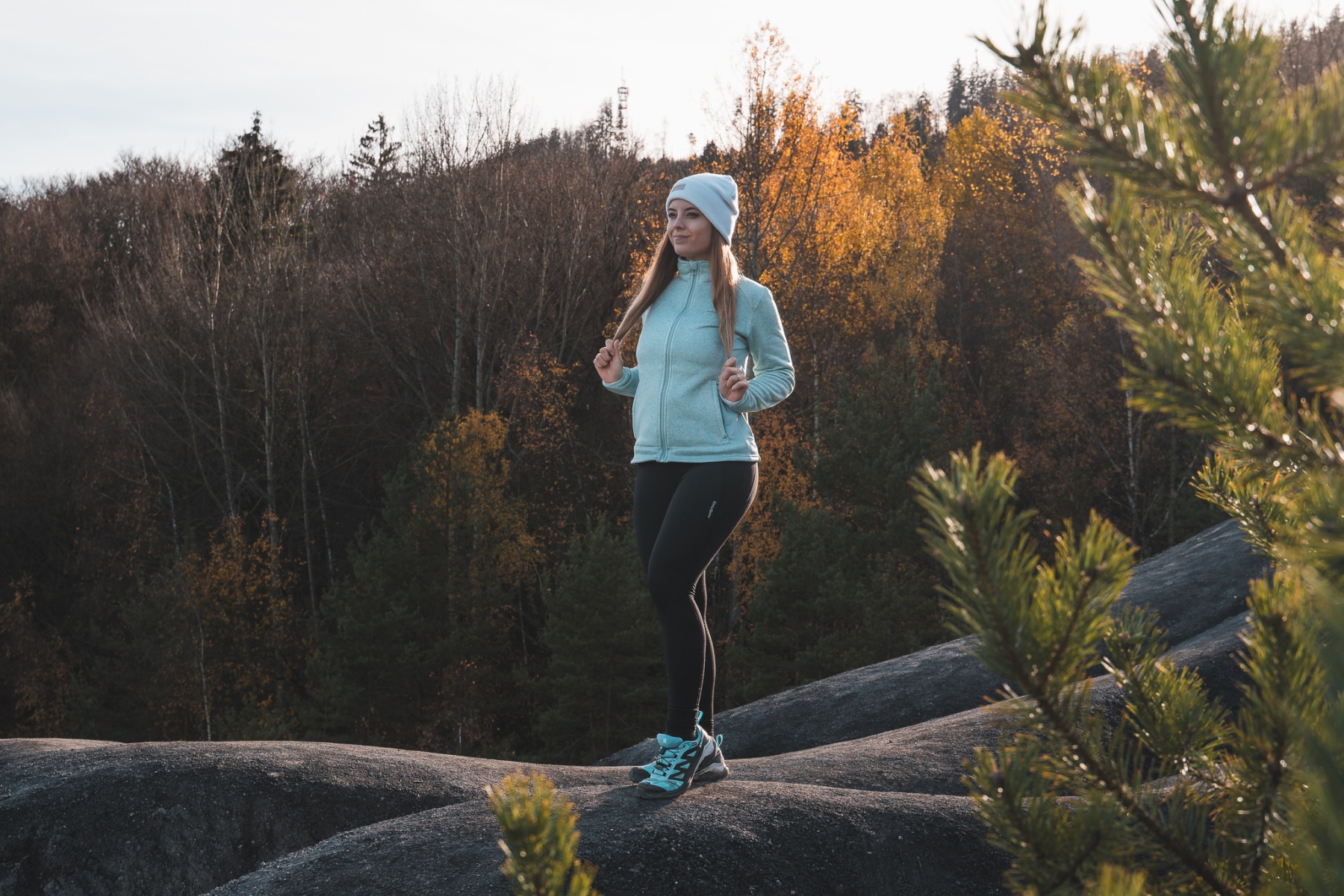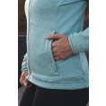 A moderately thick women’s zip-up sweater suitable for various outdoor activities, e.g. hiking.